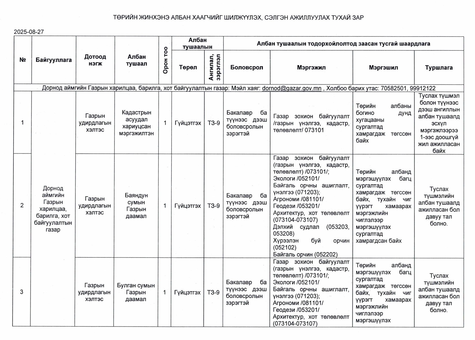 Төрийн албаны зөвлөлийн 2023 оны 25 дугаар тогтоолоор батлагдсан “Төрийн албаны шалгалт өгөх болзол болон шатлан дэвшүүлэх, сонгон шалгаруулах журам”-ын 4 дүгээр зүйлийн 4.2-т заасны дагуу төрийн байгууллага, нэгж хооронд шилжин ажиллахыг хүссэн төрийн жинхэнэ албан хаагчдыг дараах албан тушаалд холбогдох материалаа цахим шуудангаар ирүүлэхийг урьж байна.